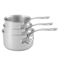 M'Urban3 Sauce Pan Set, without lid, includes (3) sauce pans: 6-3/10" dia. x 3-1/2"H, 7" dia. x 4"H, 8" dia. x 4-3/10"H, round, without lid, riveted cast stainless steel handle, non-corrosive, gas/electric/halogen/induction/oven, 3-ply contruction, stainless steel brushed finish
