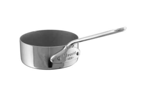 M'Minis Mini Sauté Pan, 8.3 oz. (0.25 liter), 3-1/2" dia. x 1-3/5"H, round, without lid, reinforced non-drip edge, riveted cast stainless steel handle, oven safe to 680°F, 5-ply 18/10 stainless steel, polished finish