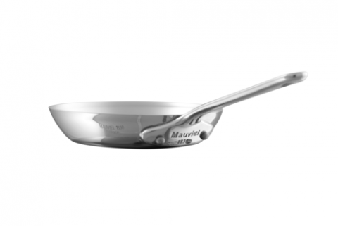 M'Minis Mini Fry Pan, 4-4/5" dia. x 9/10"H, round, reinforced non-drip edge, riveted cast stainless steel handle, oven safe to 680° F, 5-ply 18/10 stainless steel, polished finish