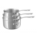 M'Cook Sauce Pan, includes (3) sauce pans: 6-3/10" dia. x 3-1/2"H, 7" dia. x 4"H, 8" dia. x 4-3/10"H, round, without lid, non-drip edge, riveted cast stainless steel stay cool handle, non-corrosive, oven safe to 680° F, gas/electric/halogen/induction/oven, 5-ply 18/10 stainless steel, polished finish