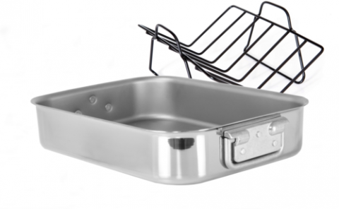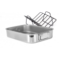 M'Cook Roasting Pan, 15-7/10"W x 11-4/5"D x 3-3/10"H, rectangular, hanging handle, with rack, non-corrosive, oven safe to 680° F, gas/electric/halogen/induction/oven, 5-ply 18/10 stainless steel, polished finish
