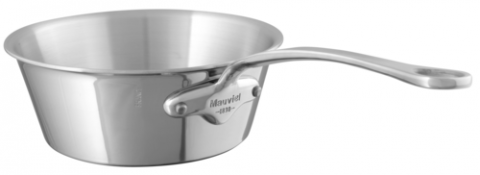 M'Cook Splayed Sauté Pan, 1.1 qt. (1 liter), 6-3/10" dia. x 2-1/2"H, round, without lid, non-drip edge, riveted cast stainless steel stay-cool handle (8-1/10"), non-corrosive, oven safe to 680°F, gas/electric/halogen/induction/oven, 5-ply 18/10 stainless steel, polished finish