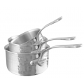 M'Elite Sauce Pan Set, without lid, includes (3) sauce pans: 6-3/10" dia., 7" dia., 8" dia., non-drip edge, riveted cast stainless steel stay cool handle, temperature range to 680° F, gas/electric/halogen/induction/oven/dishwasher safe, multi-ply 18/10 stainless steel, hammered & polished finish