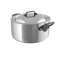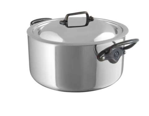 M'Cook CI Cocotte, 9.3 qt. (8.8 liter), 11" dia. x 5-1/2"H, round, with lid, non-drip edge, riveted cast iron stay-cool handles, non-corrosive, oven safe to 680°F, gas/electric/halogen/induction/oven, 5-ply 18/10 stainless steel, polished finish