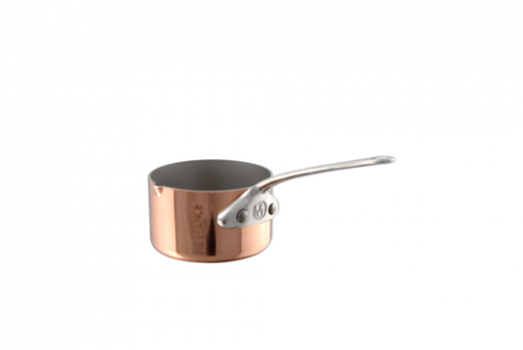 M'Minis Mini Sauce Pan, 6.7 oz. (0.2 liter), 2-7/10" dia. x 2"H, round, without lid, straight edge, pour edge, riveted stainless steel handle, gas/electric/halogen, 1.5mm, 18/10 stainless steel interior, bi-laminated copper exterior, polished finish