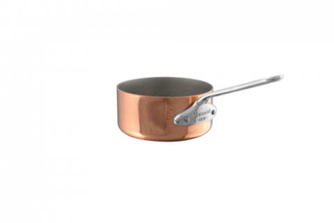 M'Minis Mini Sauté Pan, 8.3 oz. (0.25 liter), 3-1/2" dia. x 1-3/5"H, riveted stainless steel handle, gas/electric/halogen, 18/10 stainless steel interior, bi-laminated copper exterior, polished finish