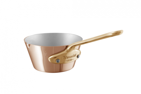 M'Minis Mini Splayed Sauté Pan, 3-1/2" dia., round, without lid, pour edge, riveted bronze handle, gas/electric/halogen, 18/10 stainless steel interior, bi-laminated copper exterior, polished finish