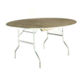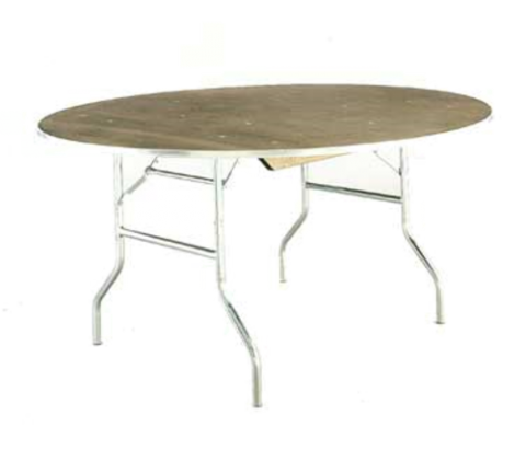 Standard Folding Table, round top, 5/8" plywood top, powder coated metal wishbone legs with full length wood runners, 36" dia., 30" high, black plastic glides std. Walnut stain w/ ply finish