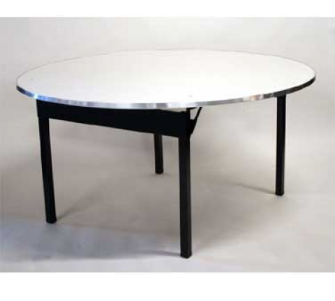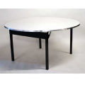 Original Folding Table, round top, 1/16” expanded white vinyl sheet bonded on 5/8" plywood top, channel aluminum edge, black powder coated chassis, 60" dia., 30" high, metal glide caps std.