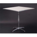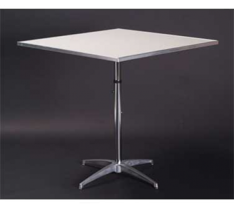 Standard Pedestal Table, square top, 1/16" expanded white vinyl sheet bonded on 5/8" plywood top, channel aluminum edge, adjustable chrome plated steel column with die cast aluminum base and mounting plate, 24" long, 24" wide, 30", 36", & 42" high, chrome steel glides std.