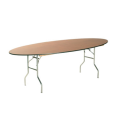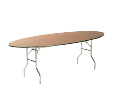 Standard Folding Table, oval top, 1/16" expanded white vinyl sheet bonded on 5/8" plywood top, channel aluminum edge, powder coated metal wishbone legs with full length wood runners, 96" long, 42" wide, 30" high, black plastic glides std.