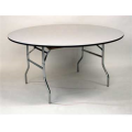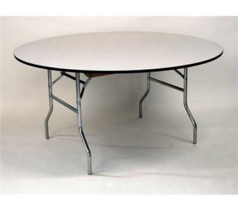 Standard Folding Table, round top, plastic laminated 5/8" plywood top (edge to be specified), powder coated metal wishbone legs with full length wood runners, 36" dia., 30" high, black plastic glides std.