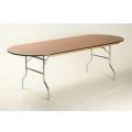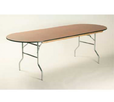 Standard Folding Table, race track top, plastic laminated 5/8" plywood top (edge to be specified), powder coated metal wishbone legs with full length wood runners, 72" long, 48" wide, 30" high, black plastic glides std.