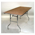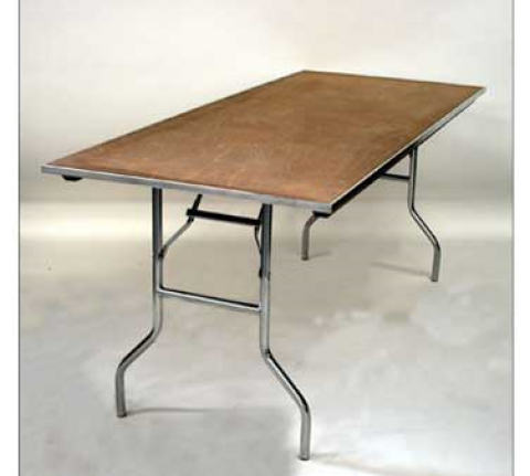 Standard Folding Table, rectangular top, 5/8" plywood top (edge to be specified), powder coated metal wishbone legs with full length wood runners, 96" long, 30" wide, 30" high, black plastic glides std.