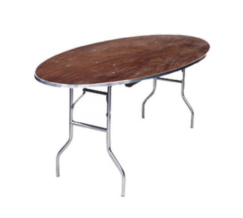 Standard Folding Table, oval top, 5/8" plywood top (edge to be specified), powder coated metal wishbone legs with full length wood runners, 96" long, 48" wide, 30" high, black plastic glides std.