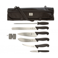BBQ Competition Set II, 8-Pc. includes 3" slim paring, 5.9" boning, 11" carving, 8" chef, 8" butcher, 10" steel, pocket sharpener, 7-pocket roll. Knives are NSF