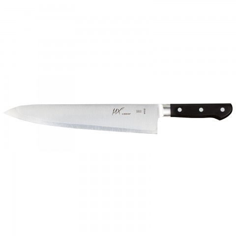MX3® Gyuto Knife, 270mm (10-5/8"), one-piece, full tang, forged, 3-layer, Japanese VG-10 super-steel core blade, taper-ground edge, triple riveted, ergonomic Delrin® handles