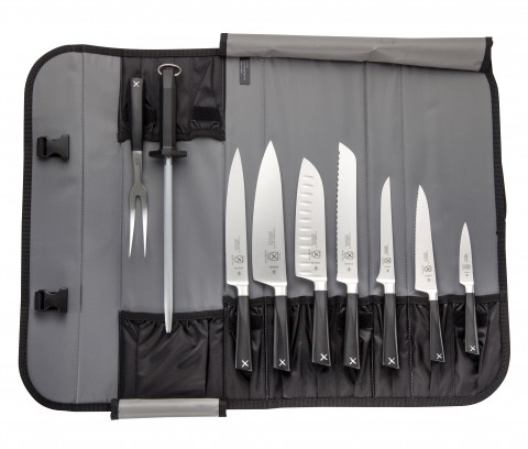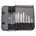 ZüM® Knife Case Set, 10-piece, includes: (1) 3" paring knife, (1) 6" wavy edge utility knife, (1) 6" boning knife, (1) 7" granton edge santoku, (1) 8" wavy edge bread knife, (1) 8" chef's, (1) 8" carving knife, (1) 6-1/4" carving fork, (1) 10" sharpening steel, and (1) knife storage roll, high-carbon, German steel blades, ergonomic POM handles, knives have limited lifetime warranty, NSF