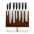 Genesis® Magnetic Board Set. 8-piece, includes (1) acacia M30725 magnetic board, (1) 10" carving knife, (1) 8" chef's knife, (1) 8" wavy edge bread knife, (1) 7" granton edge santoku knife, (1) 7" fillet knife, (1) 6" stiff boning knife, (1) 3-1/2" paring knife, high-carbon, German steel blades, black non-slip Santoprene® handles, NSF