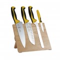 Millennia® Magnetic Board Set, 5 piece, includes: (1) rubberwood magnetic board, (1) 8" chef knife, (1) 7" Santoku knife with granton edge, (1) 3-1/2" slim paring knife, and (1) 8" offset, wavy edge bread knife, Japanese steel blades, yellow handles, NSF