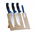Millennia® Magnetic Board Set, 5 piece, includes: (1) acacia magnetic board, (1) 8" chef knife, (1) 7" Santoku knife with granton edge, (1) 3-1/2" slim paring knife, and (1) 8" offset, wavy edge bread knife, Japanese steel blades, blue handles