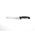 Millennia® Bread Knife, 8", wide wavy edge, stamped, high carbon, Japanese steel, black non-slip Santoprene® & polypropylene handle, with textured finger points and protective finger guard, NSF