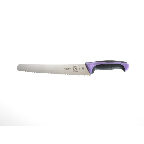 Millennia Colors® Bread Knife, 10", wide wavy edge, stamped, high carbon, Japanese steel, purple non-slip Santoprene® & polypropylene handle, with textured finger points and protective finger guard, NSF