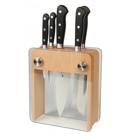 Renaissance® Block Set, 6-pieces, includes: (1) 5" utility knife, (1) 8" bread knife, (1) 8" chef's knife, (1) 6" boning knife, (1) 3-1/2" paring knife, forged, stainless steel & (1) tempered glass knife block with rubber wood, high-carbon German steel blades, ergonomic Delrin® handles, packaged in color gift box, knives are NSF