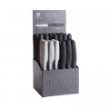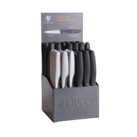 Millennia Color® Paring Knife Display, 5-3/8" x 10", 4-compartment, includes 48-count 3" Millennia® paring knives (12 each Gray & 36 each black), two-sided multi-lingual header card, epoxy coated steel holder (refill packs available, see M23930 and M23940)