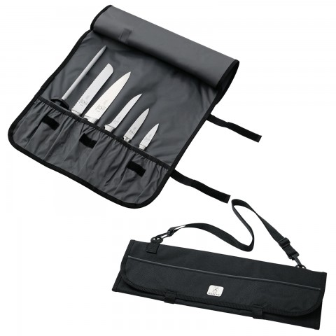 Mercer Cutlery Knife Roll, 21" x 8" x 1" rolled, 7 elastic pockets, heavy-duty construction, hook-and-loop closure, shoulder strap, black (cutlery not included)
