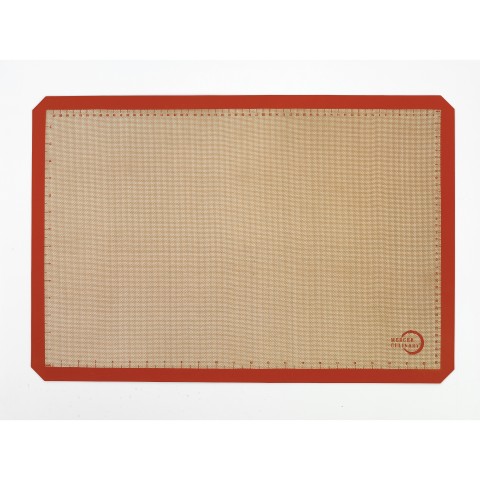 Bake Mat, full size, 16-1/2" x 24-1/2", orange border with printed measure marks in inches and cms, temperature resistant to 480°F/250°C, fits all standard full size sheet pans, angle cut corners for better pan fitting, silicone