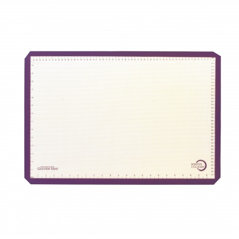 Bake Mat, full size, 16-1/2" x 24-1/2", purple border with printed measure marks in inches and cms, temperature resistant to 480°F/250°C, fits all standard full size sheet pans, angle cut corners for better pan fitting, silicone
