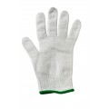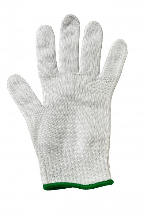 Millennia® Cut Glove, Size M 10 gauge, fits left or right hand, washable and bleach safe, stainless steel reinforced construction, FDA approved materials, ANSI level A5 cut protection, color-coded cuff to indicate size, white with green cuff