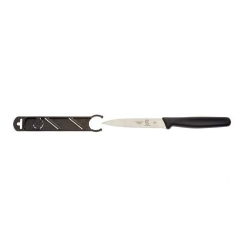 Bar Knife, 4", wavy edge, pointed tip, slide-on guard, high carbon Japanese stainless steel blade, textured polypropylene handle, NSF