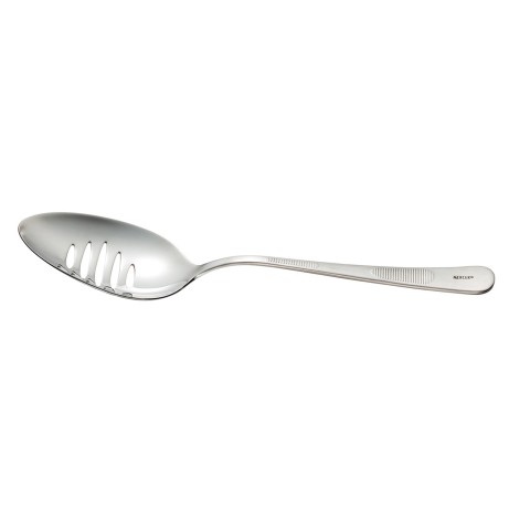 Plating Spoon, 9"L, slotted, deep well bowl with mirror finish, dual micro-serration for better grip and control, satin finish handle, 18/8 stainless steel