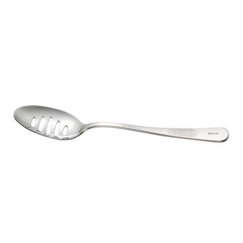 Plating Spoon, 7-7/8"L, slotted, deep well bowl with mirror finish, dual micro-serration for better grip and control, satin finish handle, 18/8 stainless steel