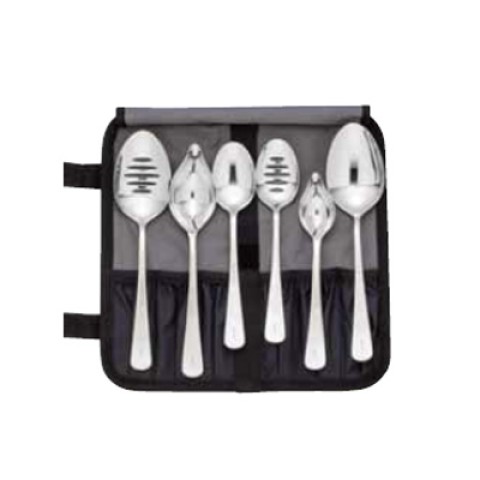 Plating Spoon Set, 7-piece, includes: (1) M35142 saucier, (1) M35143 petite saucier, (1) M35138 9" solid, (1) M35140 7-7/8" solid, (1) M35139 9" slotted, (1) M35141 7-7/8" slotted and (1) M30920 heavy duty compartment roll