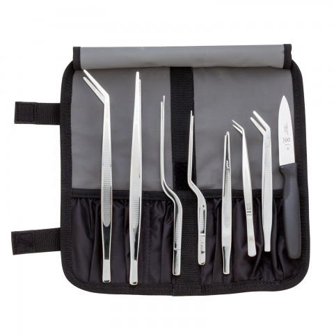Plating Tongs Set, 10-piece, includes: (1) M35130 9-3/8" straight, (1) M35135 6-1/8" straight, (1) M35131 9-3/8” curved tip, (1) M35134 6-1/8" curved tip, (1) M35137 7-7/8" offset, (1) M35136 6-1/2" offset, (1) M35144 6-1/8" fine point curved, (1) M23900 3" black handle Millennia™ paring knife, (1) M33110 knife guard for M23900, (1) M30920 heavy duty compartment roll