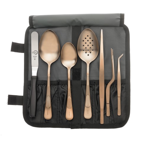 Plating Set, 8-piece, includes: (1) M35138RG 9" solid plating spoon, (1) M35140RG 7-7/8" solid plating spoon, (1) M35160RG 9" perforated plating spoon, (1) M35236RG 6-1/2" offset plating tong, (1) M35230RG 9-3/8" straight plating tong, (1) M35244RG 6-1/8" fine point curved tip plating tong, (1) M18830 4-1/4" offset spatula, (1) M30920 heavy duty 6-compartment tool roll bag, rose gold