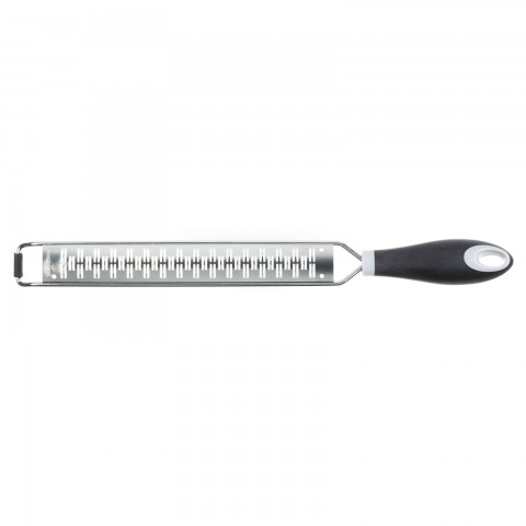 MercerGrates™ Grater, 8-7/8" x 1-3/16" blade, 15" overall length, ribbon-narrow, 18/8 stainless steel blades, rounded Santoprene® and polypropylene handles, handle hole for hanging, protective polyethylene cover