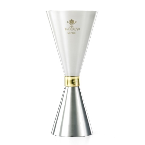 Barfly® Slim Style Jigger, 1 & 2 oz., with internal marking lines, gold-plated center band, mirror finish exterior, satin finish interior, 18/8 stainless steel