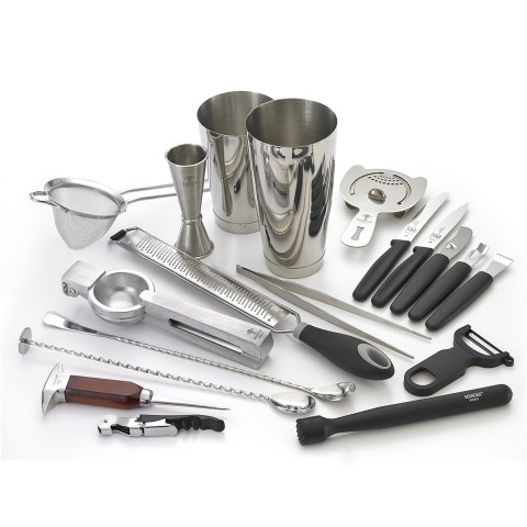 Barfly® Deluxe Set, 18-piece, includes: (1) cocktail shaker set, (1) fine mesh strainer, (1) 9-3/8” Precision Plus™ straight tong, (1) 11-13/16” bar spoon with muddler end, (1) heavy-duty spring bar strainer, (1) 1 oz. x 2 oz. jigger, (1) 13-3/16” bar spoon, (1) black Y-peeler, (1) channel knife, (1) composite muddler, (1) ice pick, (1) cast aluminum juicer, (1) orange peeler, (1) citrus zester, (1) waiter’s corkscrew, (1) 4-1/3” rounded tip, wavy edge bar knife, (1) 4” pointed tip, plain edge bar knife, (1) narrow fine zester, 18/8 stainless steel