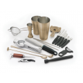 Barfly® Deluxe Set, 18-piece, includes: (1) cocktail shaker set, (1) fine mesh strainer, (1) 9-3/8” Precision Plus™ straight tong, (1) 11-13/16” bar spoon with muddler end, (1) heavy-duty spring bar strainer, (1) 1 oz. x 2 oz. jigger, (1) 13-3/16” bar spoon, (1) black Y-peeler, (1) channel knife, (1) composite muddler, (1) ice pick, (1) cast aluminum juicer, (1) orange peeler, (1) citrus zester, (1) waiter’s corkscrew, (1) 4-1/3” rounded tip, wavy edge bar knife, (1) 4” pointed tip, plain edge bar knife, (1) narrow fine zester, 18/8 stainless steel core, Antique Gold-plated finish