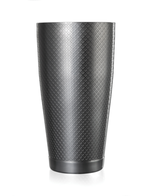 Barfly® Diamond Lattice Shaker, 28 oz., 3-5/8" dia. x 7"H, capped bottom, 18/8 stainless steel core, satin finish interior, gun metal black exterior finish, intricate etched pattern design