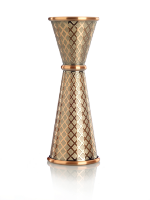 Barfly® Diamond Lattice Japanese Style Jigger, 1 & 2 oz., with internal marking lines, 18/8 stainless steel core, antique copper-plated finish