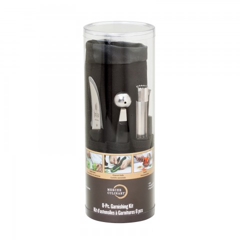 Mercer Cutlery® Garnishing Kit, 8 piece, includes: (1) 2-1/2" peeling knife, (1) double melon baller, (1) citrus zester, (1) channel knife, (1) oval melon baller, (1) vegetable peeler, (1) apple corer, (1) heavy-duty 600 denier poly/canvas storage roll with hook-and-loop tabs, thick mil plastic tube packaging