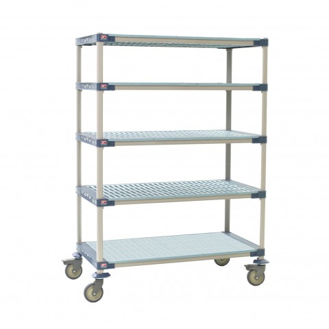 MetroMax® 4 Mobile Shelving Unit, five tier, 48"W x 18"D x 80"H, (4) open grid polymer shelves & (1) solid sectioned mat shelf, each with removable shelf mats, unit load capacity of 750 lbs., (4) polymer MX74UP posts, wedge connectors, (4) polymer casters (2 swivel & 2 braked), built in antimicrobial product protection, NSF