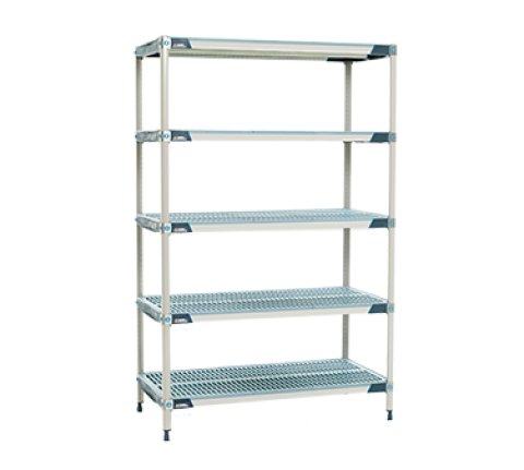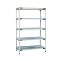 MetroMax® i Starter Shelving Unit, 72"W x 18"D x 74"H, rust proof, 750 lb. capacity per shelf, 2000 lb. capacity per unit, (5) open grid polymer shelves with reinforced type 304 stainless steel corners and removable polymer shelf mats, bag of (4) wedge connectors included with each shelf, (4) polymer posts, Microban antimicrobial product protection, KD, NSF