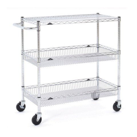 Basket Cart, (2) wire basket shelves, (1) standard wire shelf, extended handle, chrome plated finish, 4" swivel casters (2 braked), KD, NSF