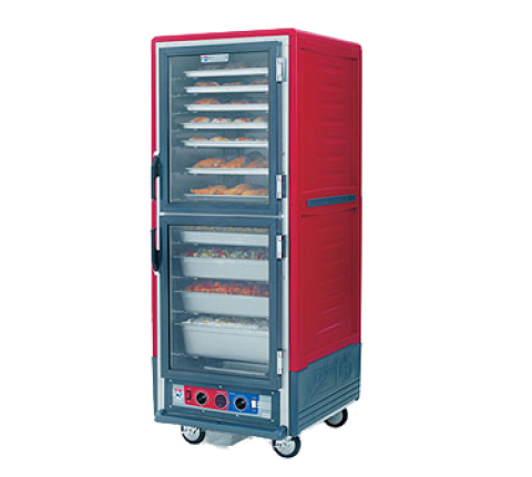 C5™ 3 Series Heated Holding Cabinet, with Red Insulation Armour™, mobile, full height, insulated, Dutch clear polycarbonate doors, removable bottom mount control module, thermostat to 200°F, lip load slides on 1-1/2" centers (34) 18" x 26" pan capacity, 5" casters (2 with brakes), aluminum, 120v/60/1-ph, 2000 watts, 16.7 amps, NEMA 5-20P, cULus, NSF